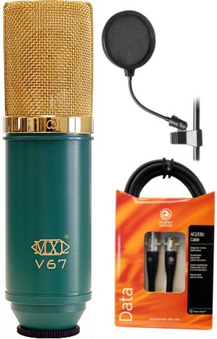 The MXL-V67G sports a gold plated round grill and distinctive vintage brass body design. It was designed for vocals, so this mic will surely stand out in any crowd. The V67G sounds as golden as its looks. Its 1" gold sputtered, 6-micron diaphragm, FET preamp and transformer balanced output combine to create an open, vintage sound. The double screen, round grill, also helps to produce a smooth, even frequency response. It comes complete with stand adapter.